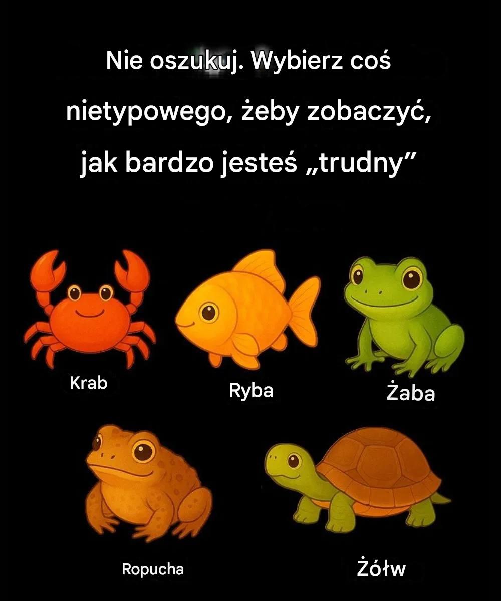 Jesteś typem osoby, która jako pierwsza zauważa różnice w budowie. Krab wyróżnia się pazurami, dodatkowymi nogami i zupełnie innym kształtem ciała niż pozostałe. W przeciwieństwie do żab, żółwi, ropuch i ryb, które mają dwustronne, wydłużone ciała, krab wygląda niemal okrągło.